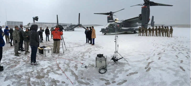 The two Ospreys had flown in the day before from the 27th Special Operations Wing in New Mexico. So while we scaled down our set, the aircraft and their crew made a perfect backdrop for Hannah and Kevin to open the show, with special guest Lt. General Michelle D. Johnson, the Superintendent of the Academy.