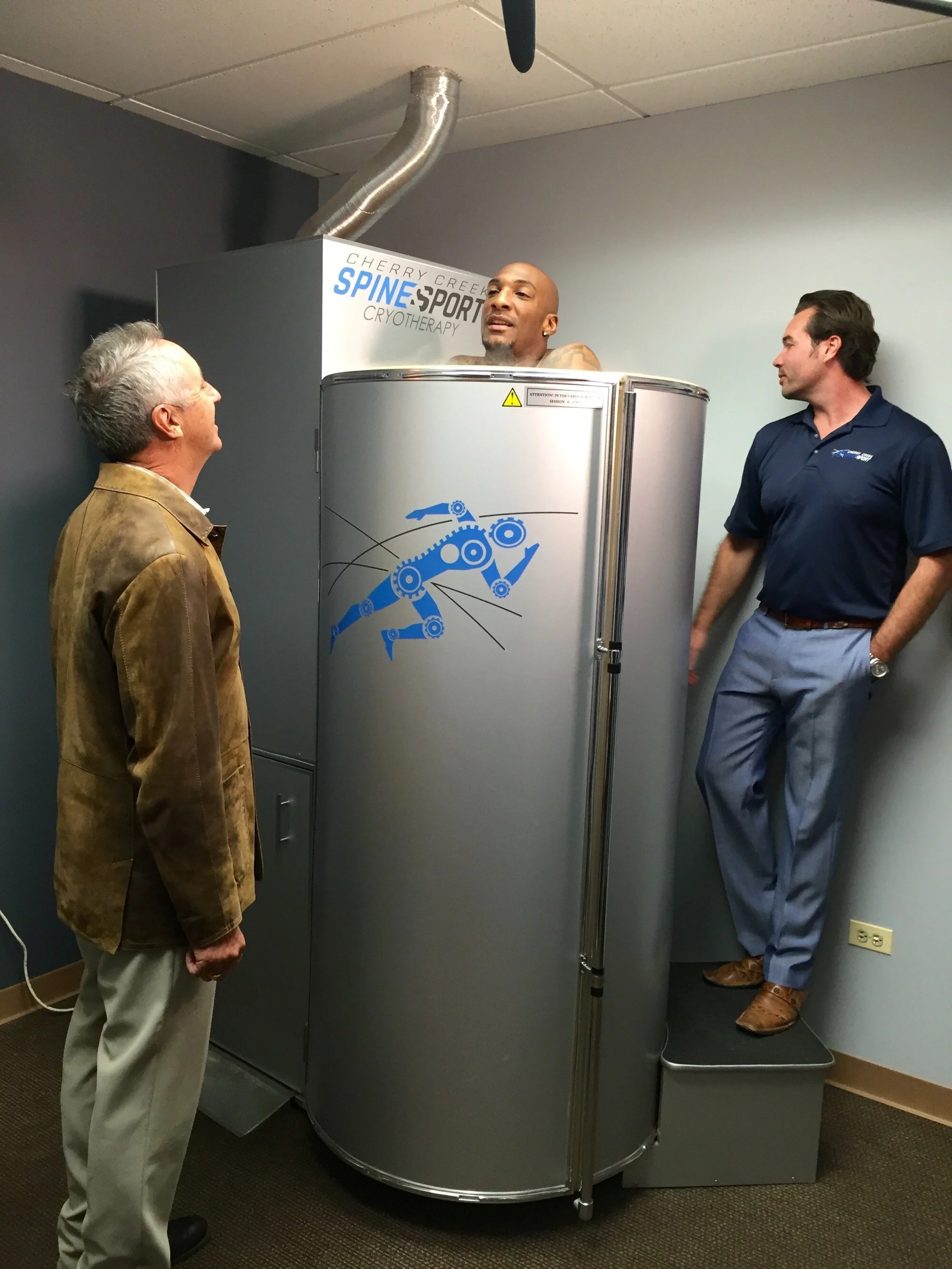 Then we camped out at Cherry Creek Spine in Denver as player after player came in for quick treatments in their cryosauna. Rick interviewed them during and after treatment, and then went in himself. Things got even funnier with Brandon Marshall at the controls!
